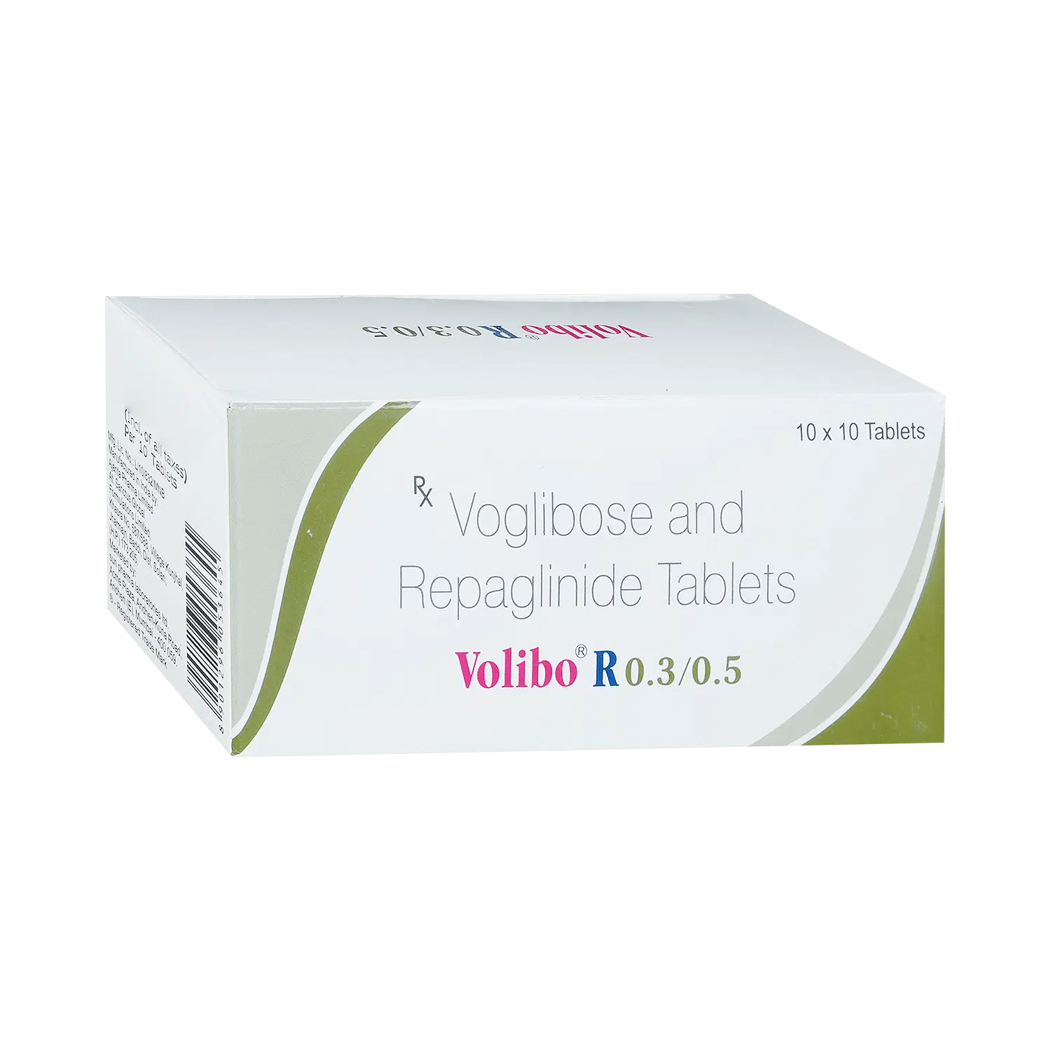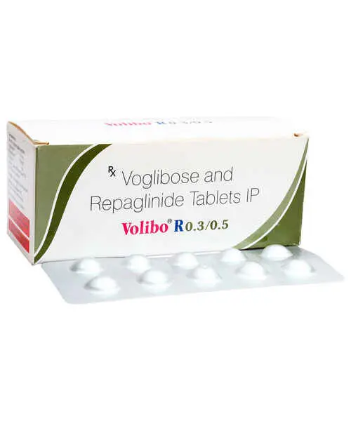Volibo R 0.3/0.5 Tablet – Dual-Mechanism Glucose Control for Type 2 Diabetes Volibo R 0.3/0.5 Tablet is a powerful combination therapy developed to support adults living with type 2 diabetes mellitus. By addressing both insulin release and carbohydrate absorption, it offers effective control of post-meal blood sugar spikes. This formulation is recommended when single-drug therapy or dietary adjustments are insufficient to maintain optimal glucose levels. Volibo R 0.3/0.5 Tablet contains two clinically proven ingredients: Repaglinide stimulates insulin production from the pancreas, particularly in response to meals, helping lower elevated blood glucose levels quickly. Voglibose slows the digestion of complex carbohydrates in the intestine, minimizing rapid increases in blood sugar after eating. Together, these active agents provide a synergistic effect that improves overall glycaemic control and helps reduce the risk of long-term diabetes-related complications. Key Benefits: Targets postprandial hyperglycemia with precision, encourages insulin release only when needed, reducing the chance of unnecessary lows, helps prevent blood sugar spikes after meals by delaying carbohydrate breakdown, supports long-term glucose stability, minimizing the risk of kidney, nerve, and cardiovascular complications, complements dietary efforts and physical activity for better diabetes management, can delay or reduce dependence on insulin when used as part of a comprehensive care plan. Uses: Volibo R 0.3/0.5 Tablet is indicated for managing Type 2 Diabetes Mellitus in adults, enhancing post-meal blood sugar regulation, improving glycaemic control when used alongside a balanced diet and exercise. How to Take: Take the tablet 30 minutes before a meal. Use once or twice daily, as directed by your physician. Swallow whole with water — do not chew, crush, or break. Maintain a consistent schedule for best blood sugar control. Always follow the prescribed dosage and instructions from your healthcare provider. Do not discontinue without medical advice, even if you feel well. Side Effects: While generally well-tolerated, some users may experience abdominal bloating or discomfort, diarrhea or loose stools, flatulence, mild nausea or indigestion, occasional hypoglycemia (especially when combined with other anti-diabetic agents). If symptoms persist or interfere with daily life, consult your doctor. Severe or allergic reactions are rare but should be addressed immediately. Precautions & Warnings: Inform your doctor if you are pregnant, breastfeeding, or planning to conceive. Disclose any history of kidney or liver disease. Not suitable for patients with type 1 diabetes or those experiencing diabetic ketoacidosis. Avoid use if allergic to repaglinide or voglibose. Inform your healthcare provider about any other medications or supplements you’re taking. Lifestyle & Dietary Considerations: Focus on whole grains, fresh vegetables, and high-fiber foods. Minimize intake of processed sugars and saturated fats. Engage in 150 minutes of moderate activity or 75 minutes of intense exercise weekly. Reduce stress levels, as stress can raise blood sugar. Maintain a healthy BMI and keep blood pressure within normal range. Storage: Store in a cool, dry location away from direct heat or light. Ideal storage temperature: 10°C to 25°C, but not exceeding 30°C. Keep out of reach of children and pets. Overdose: Taking more than the recommended dose may lead to undesirable effects such as low blood sugar or gastrointestinal upset. In case of accidental overdose, seek immediate medical assistance. Drug Interactions: Certain drugs can affect how Volibo R 0.3/0.5 Tablet works. Avoid or consult your doctor if you are taking Gemfibrozil, Gatifloxacin, or consuming grapefruit juice. Regular monitoring and consultation with your healthcare provider are essential for safe use. Therapeutic Class: Category: Oral Anti-Diabetics; Class: Alpha-glucosidase inhibitor + Meglitinide analog. Product Variants & Keywords: Volibo R 0.3/0.5 Tablet, Volibo R Tablet for diabetes, Repaglinide and Voglibose Tablet, Volibo R blood sugar control, Post-meal glucose medicine Volibo R.