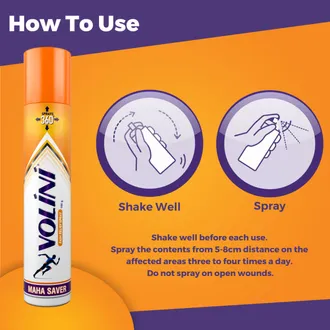 Volini Pain Relief Spray is suitable for managing: Sprains and strains, Sports injuries, Rheumatoid arthritis and osteoarthritis, Ankylosing spondylitis, Lower back pain, Neck and shoulder stiffness, Muscle soreness due to exertion or fatigue