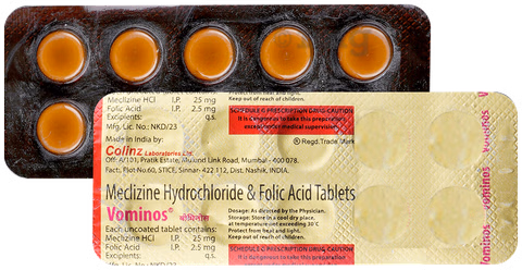 Vominos Tablet – For Effective Relief from Pregnancy-Induced Nausea Vominos Tablet is a trusted combination therapy formulated to manage nausea and vomiting commonly experienced during pregnancy. Specially designed to ease the discomfort caused by hormonal changes, this medicine works by blocking the brain’s nausea signals, offering expecting mothers a smoother, more comfortable pregnancy journey. Each tablet combines three active ingredients: Doxylamine – an antihistamine that relieves nausea and promotes calmness; Pyridoxine (Vitamin B6) – supports metabolic processes and helps reduce pregnancy-related nausea; Folic Acid – crucial for fetal neural development and overall maternal nutrition. This comprehensive approach not only alleviates queasiness but also contributes to the baby’s brain development and boosts maternal immunity. Vominos Tablet is recommended to be taken with food, as directed by your physician, and for the full duration prescribed, even if symptoms improve early. Key Benefits: Reduces nausea and vomiting during all pregnancy stages; Supports fetal brain and spinal cord development with folic acid; Helps maintain maternal energy and nutrient balance; Minimizes fatigue and improves daily comfort during early pregnancy. How to Use: Swallow the tablet whole with water—do not crush or chew; Take it with food to improve absorption and reduce potential stomach discomfort; Always follow the dosage schedule as prescribed by your healthcare provider. Possible Side Effects: While Vominos Tablet is generally well-tolerated, some users may experience temporary side effects as their body adjusts to the medication. These may include: Drowsiness or sleepiness, Dry mouth, Dizziness, Constipation, Fatigue. These effects usually subside without medical intervention. If symptoms persist or worsen, consult your healthcare provider promptly. Important Safety Information: Pregnancy: Safe when used as prescribed. Clinically recommended for managing pregnancy-induced nausea. Breastfeeding: Generally safe in standard doses. Extended use should be monitored to avoid potential drowsiness in the infant. Driving or Operating Machinery: Avoid activities requiring alertness if you feel sleepy or dizzy. Kidney/Liver Conditions: Usually safe, but consult your doctor if you have any pre-existing conditions. Alcohol Consumption: Avoid alcohol during treatment to prevent enhanced drowsiness or dizziness. Missed a Dose? If you forget to take a dose, take it as soon as you remember. If it’s close to the time of your next dose, skip the missed one and continue your regular schedule. Do not double the dose. Storage Guidelines: Store in a cool, dry place away from direct sunlight; Keep out of reach of children; Do not use after the expiration date mentioned on the packaging. Product Variants & Keywords: Vominos Tablet, Vominos anti-nausea tablet, Vominos for pregnancy sickness, Vominos with folic acid, Vominos doxylamine vitamin B6, morning sickness tablet Vominos, nausea and vomiting medicine for pregnancy