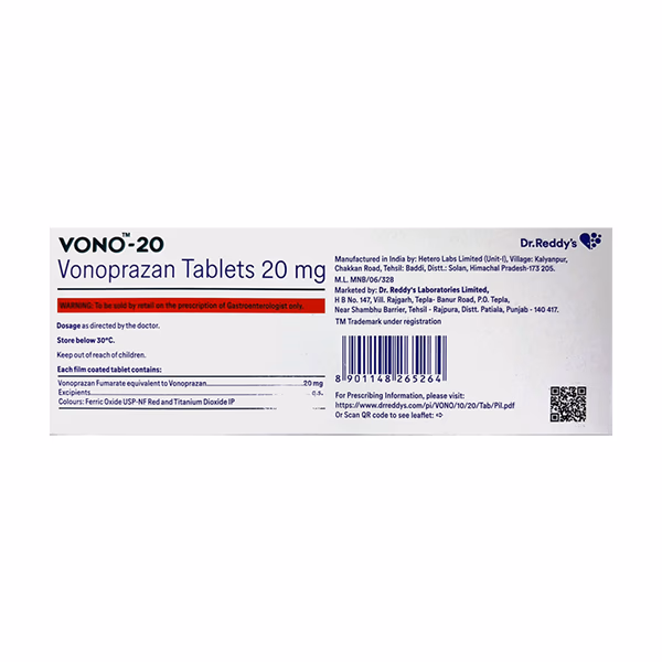 Product Variants & Keywords: Vono 20 Tablet, Vono Tablet for Acid Reflux, Vono 20 for Ulcers, Stomach Acid Reducer, GERD Treatment Tablet, Anti-ulcer Medication, Proton Pump Inhibitor Tablet