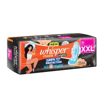 Whisper Choice Night XXL Sanitary Pads – Overnight Protection for Heavy Flow Whisper Choice Night XXL Sanitary Pads are crafted to deliver superior overnight protection for women experiencing heavy menstrual flow. Designed with an extra-long and wide structure, these pads offer maximum coverage while you sleep, allowing you to rest undisturbed and wake up feeling dry and confident. The high-absorbency core is engineered with advanced materials like superabsorbent polymers, cellulose, and cotton, which work together to lock in moisture and prevent leakage. Whether you sleep on your back, side, or stomach, this pad is designed to stay securely in place and provide all-night dryness. Whisper Choice Night XXL features flexible adhesive wings that hold the pad firmly to your underwear, adding an extra layer of leak protection and reducing the chances of movement during the night. The breathable top layer ensures comfort, while the discreet design helps manage odour and maintain freshness through the night. Each pack contains 18 individually wrapped pads, making it a practical and hygienic option for home or travel. This product is ideal for those who need extended protection and peace of mind during their period. Features: Extra-long and ultra-wide for complete overnight coverage. Superior absorption designed for heavy flow days and nights. Soft, breathable top layer for skin comfort. Adhesive wings offer a secure fit and reduce pad shifting. Discreet, odour-controlling design for fresh and confident sleep. How to Use: Remove the pad from its wrapper and peel off the adhesive backing. Place it on your underwear, ensuring the wider end is at the back for night use. Press firmly and secure the wings by wrapping them around the sides of your underwear. Change the pad in the morning or when saturated. Dispose of the used pad in a covered bin—do not flush. Key Benefits: ✅ Overnight Confidence: Extra-long design ensures uninterrupted sleep with no fear of leaks. ✅ Heavy Flow Friendly: Specially designed to manage high absorbency needs during the night. ✅ Gentle on Skin: Made with soft-touch materials to reduce the risk of rashes or irritation. ✅ No Odour Worries: Built-in odour control keeps you feeling fresh till morning. ✅ Secure Fit: Winged design keeps the pad in place for total leak protection, even with movement. Product Variants & Keywords: Whisper Choice Night XXL Sanitary Pads, Whisper Night Pads for Heavy Flow, Extra Long Sanitary Napkins for Women, Whisper Overnight Pads with Wings, Whisper Choice XXL Pads for Night Use, Leak-Proof Sanitary Pads for Night