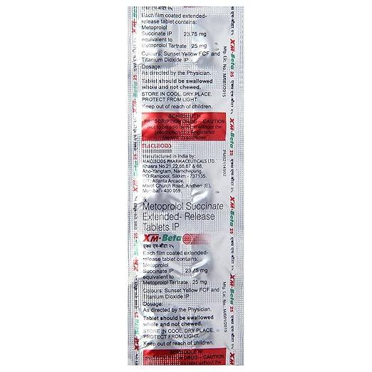 XM Beta 25mg Tablet is a prescription medication designed to manage high blood pressure (hypertension) and support cardiovascular health. Its active ingredient, a beta-blocker, works by reducing heart rate, decreasing the force of heart contractions, and relaxing blood vessels. This combination helps lower elevated blood pressure, improves blood flow, and reduces strain on the heart. Regular use of XM Beta 25mg under medical supervision helps prevent complications associated with hypertension, such as heart attack, stroke, and kidney damage. It is particularly useful for adults with persistent hypertension or heart-related conditions. By supporting heart function and circulation, XM Beta 25mg Tablet contributes to overall cardiovascular wellness, improved energy levels, and enhanced quality of life.