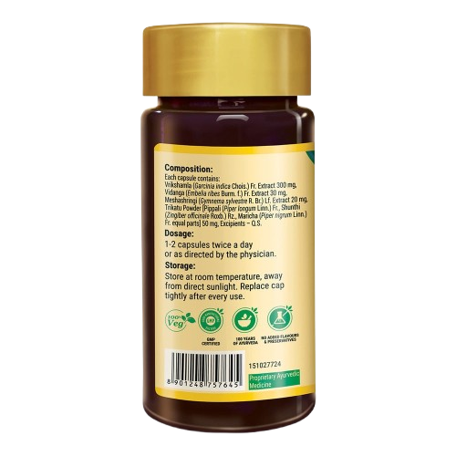Ingredients: Garcinia, Vidanga, Meshashringi, Trikatu (Sunthi, Maricha, Pippali)