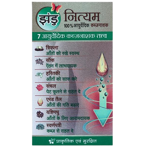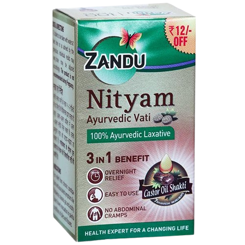 Zandu Nityam Ayurvedic Vati is a natural, non-habit forming laxative that supports gentle and effective relief from constipation. It promotes bowel regularity, soothes intestinal walls, and is helpful against common digestive issues like gas, acidity, and flatulence. The formulation contains the goodness of 7 Ayurvedic herbs, offering overnight relief without cramps.