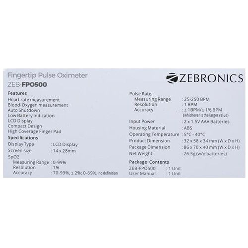 The Zebronics ZEB-FPO500 Pulse Oximeter is a compact, easy-to-use device designed to monitor blood oxygen saturation (SpO2) levels and pulse rate accurately. Featuring a clear LCD display, auto shutdown function, and low battery indication, this oximeter offers reliable readings with minimal effort. Its energy-efficient and portable design makes it suitable for both home and clinical use.