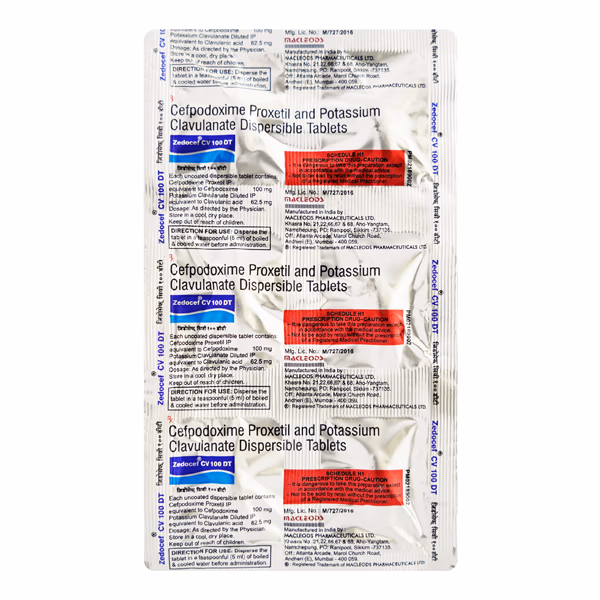 Zedocef CV 100mg/62.5mg Tablet DT is a powerful combination antibiotic formulated to treat a wide range of respiratory tract infections caused by harmful bacteria. Designed for pediatric use, this dual-action tablet dissolves in water for easier consumption and faster absorption. It combines the effectiveness of Cefpodoxime Proxetil, a broad-spectrum cephalosporin antibiotic, with Clavulanic Acid, a beta-lactamase inhibitor that enhances its antibacterial activity.