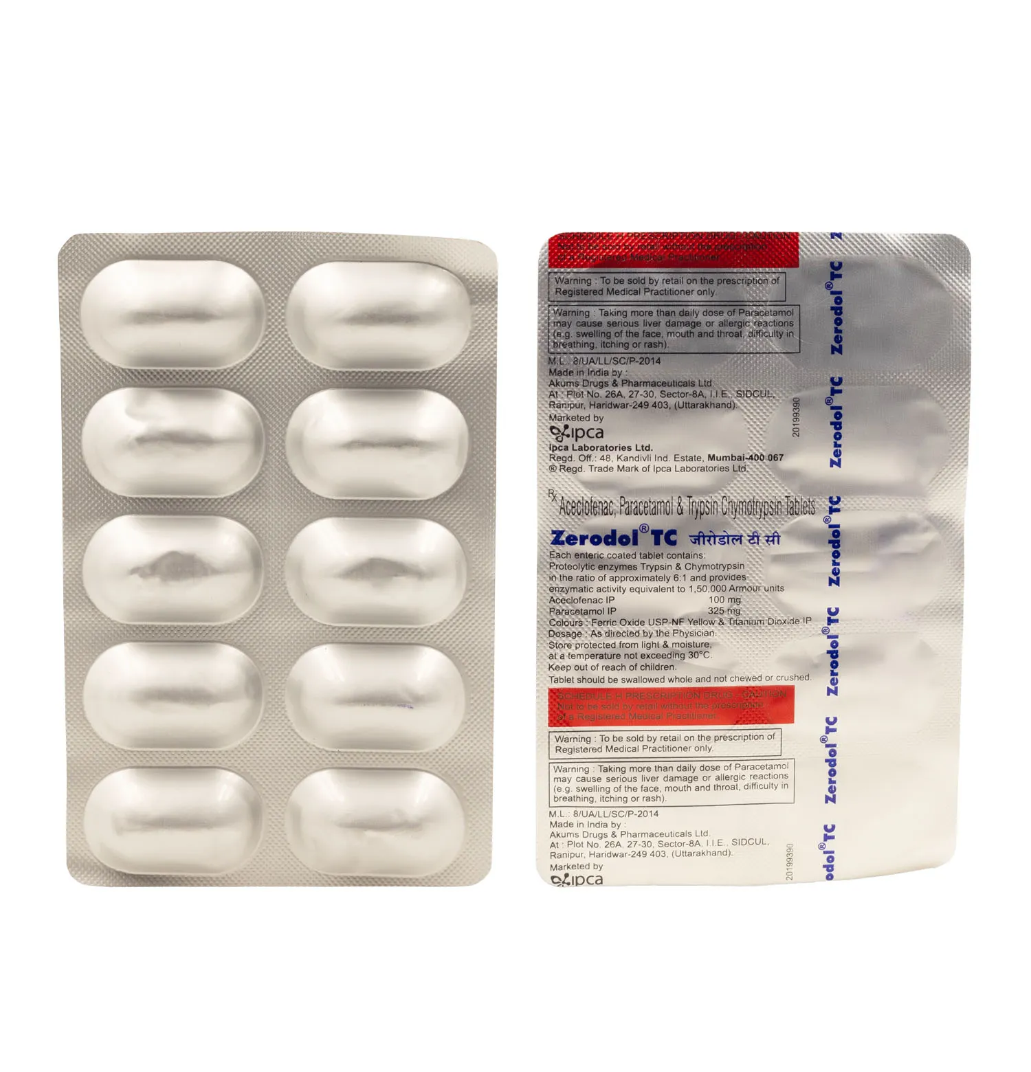 Zerodol TC Tablet – Targeted Relief for Pain and Inflammation Zerodol TC Tablet is a clinically formulated pain relief solution that helps manage both acute and chronic inflammatory conditions. Combining the power of Aceclofenac, Paracetamol, and Trypsin-Chymotrypsin, this tablet delivers a multi-action approach to reduce pain, inflammation, swelling, and fever associated with various musculoskeletal disorders. Commonly recommended for conditions such as rheumatoid arthritis, osteoarthritis, and ankylosing spondylitis, it also helps alleviate short-term symptoms like back pain, muscle aches, toothaches, or sore throat. The added enzyme complex supports faster recovery by promoting better blood flow and tissue healing. Key Benefits – Powerful Anti-Inflammatory Action: Helps reduce swelling and stiffness in joints and soft tissues. – Effective Pain Management: Provides relief from moderate to severe pain including muscle strains and post-surgical discomfort. – Reduces Fever: Paracetamol offers antipyretic benefits during inflammation-induced fever. – Enhanced Tissue Repair: The proteolytic enzymes improve circulation at the inflammation site to accelerate healing. – Convenient Dosing: Easy-to-take tablet that fits into your daily routine with or after meals. Directions for Use Take the medicine exactly as prescribed by your healthcare provider. Swallow the tablet whole with water. Do not chew or crush. Always consume with food to minimize gastric discomfort. Do not exceed the recommended dose or extend the duration without medical guidance. Possible Side Effects Most users tolerate this medication well. However, some may experience: nausea or vomiting, indigestion or heartburn, abdominal discomfort, diarrhea or constipation, loss of appetite, dizziness or mild drowsiness. If these symptoms persist or worsen, consult your healthcare provider. Precautions & Safety Information Pregnancy: Use only under medical supervision if you are pregnant or planning to conceive. Breastfeeding: Safety data is limited; speak to your doctor before use. Driving & Machinery: May cause drowsiness or blurred vision. Avoid activities requiring alertness if affected. Kidney Function: Use with caution in patients with mild to moderate kidney disease. Not advised in severe renal impairment. Liver Function: Regular liver function monitoring may be required. Avoid use in active or severe liver disease. Alcohol: Should be avoided as it may increase the risk of drowsiness or gastric side effects. Missed a Dose? If you forget a dose, take it as soon as you remember. If your next scheduled dose is near, skip the missed one and continue with the regular timetable. Do not take a double dose. Storage Instructions Store in a cool, dry place away from direct sunlight. Keep out of reach of children. Product Variants & Keywords Zerodol TC Tablet, ZerodolTC for Arthritis Pain, Zerodol TC Inflammation Relief, Zerodol TC Muscle Pain Tablets, Zerodol TC for Fever and Pain, Zerodol TC Trypsin Chymotrypsin Tablets, Zerodol TC Joint Pain Relief