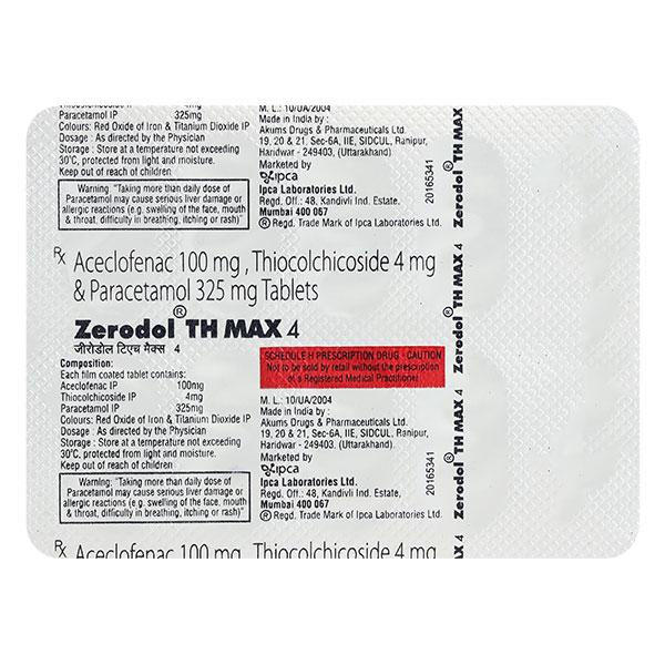 Product Variants & Keywords Zerodol TH Max Tablet, Zerodol TH Max 4mg 100mg 325mg, Zerodol TH Max for Muscle Pain, Zerodol TH Max Muscle Relaxant, Zerodol TH Max Anti-inflammatory Tablets, Zerodol TH Max for Spasm Relief, Buy Zerodol TH Max Online, Aceclofenac Paracetamol Thiocolchicoside Tablet, Zerodol TH Max 4mg Pain Relief