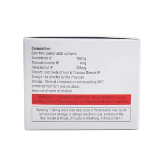 Key Benefits Combines Thiocolchicoside (muscle relaxant), Aceclofenac (NSAID), and Paracetamol (analgesic/antipyretic) to deliver complete pain relief Targets inflammation and pain at the source Relieves muscle stiffness and improves flexibility Enhances mobility and supports daily physical activities Helps in faster recovery from muscle injuries and strain