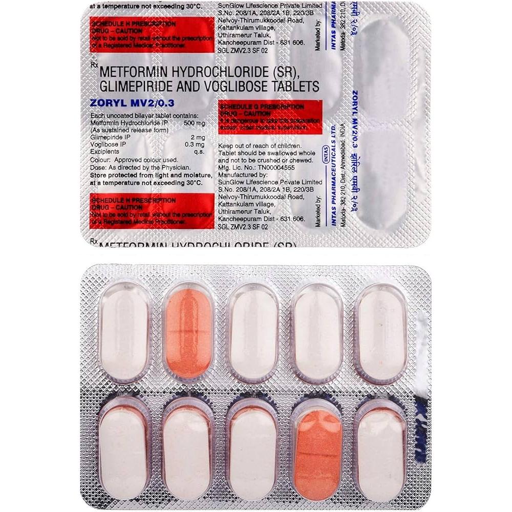 Zoryl MV 2/0.3 Tablet SR is an anti-diabetic medicine used for the management of type 2 diabetes mellitus in adults. It combines three medicines that work together to help control blood sugar levels effectively. This medication helps your body to utilize insulin more efficiently and prevents spikes in blood glucose, especially after meals.