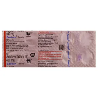 Zovirax 400 Tablet contains Acyclovir, an antiviral drug. It prevents the herpes virus from producing new copies, helping the body’s immune system to control the infection and reduce healing time.